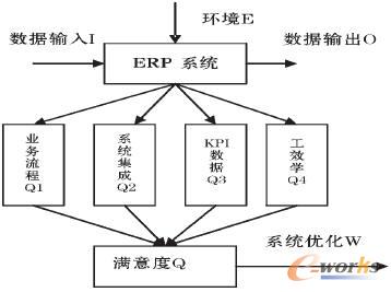 ERP實(shí)施評(píng)估的核心是系統(tǒng)實(shí)施滿意度Q的評(píng)估, 這包括4個(gè)方面:業(yè)務(wù)流程Q1、系統(tǒng)集成Q2、KPI數(shù)據(jù)Q3、工效學(xué)Q4。