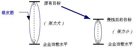 企業(yè)用戶實(shí)施ERP的主要目的是切實(shí)提升企業(yè)的管理水平,但這種提升的程度在某種程度上是難以量化描述的。因此,在使用“量身定制”的軟件時(shí),會(huì)容易忘記預(yù)期目標(biāo),在各種利益均衡和困難面前降低原有的目標(biāo),這種企業(yè)預(yù)期目標(biāo)可能受到侵蝕而在不自覺中降低的風(fēng)險(xiǎn)稱為“目標(biāo)侵蝕”風(fēng)險(xiǎn)。這種風(fēng)險(xiǎn)的模型見圖2,圖中,當(dāng)目標(biāo)在不自覺中受到侵蝕時(shí),橡皮筋所產(chǎn)生的拉力立即減小,反過來講,改變現(xiàn)狀的動(dòng)力也就減小,其結(jié)果是不僅總體目標(biāo)要求降低,而且改變現(xiàn)狀的動(dòng)力和力度也會(huì)跟著降低,實(shí)施ERP將得不到其預(yù)期的效果。
