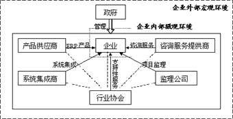 現(xiàn)在,隨著信息化時(shí)代的到來,中國已經(jīng)有越來越多的企業(yè)開始接觸并認(rèn)識(shí)到ERP的重要性。ERP,作為一個(gè)大型的管理系統(tǒng)軟件,可以在整合、系統(tǒng)地管理企業(yè)的有關(guān)人、財(cái)、物各方面的資源和供、產(chǎn)、銷的各個(gè)經(jīng)營環(huán)節(jié)發(fā)揮它不可忽視的巨大作用。但是,我們也應(yīng)該清醒地認(rèn)識(shí)到,ERP的應(yīng)用并不是一個(gè)脫離于其特定的環(huán)境因素和諸多相關(guān)社會(huì)角色而獨(dú)立存在的。這些重要因素毫無疑問會(huì)對(duì)企業(yè)成功實(shí)施、應(yīng)用ERP產(chǎn)生一定影響,所以,如何協(xié)調(diào)好這些方面的因素的關(guān)系對(duì)于那些已經(jīng)實(shí)施、或想要實(shí)施ERP的企業(yè)來說,就顯得至關(guān)重要了。這里,我們也就想針對(duì)這一問題,來談?wù)勎覀兊目捶ā?BR> 其實(shí),無論是應(yīng)用ERP的企業(yè)也好,沒有應(yīng)用ERP的企業(yè)也好,都需要在一定的內(nèi)外環(huán)境中進(jìn)行經(jīng)營運(yùn)作。只是更好的環(huán)境更加有利于ERP的應(yīng)用和發(fā)展而已。具體來說,我們可以將環(huán)境因素分為兩個(gè)方面來講:企業(yè)外部的宏觀環(huán)境和企業(yè)內(nèi)部的微觀環(huán)境。