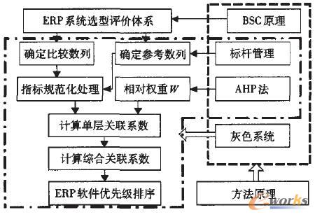對于制造企業(yè)ERP選型,選型小組中既有制造專家,也有經(jīng)營決策領(lǐng)導,不同業(yè)務領(lǐng)域的成員會持有各種不同觀點。解決這些差異的辦法是盡量將涉及的變量目標化,并且給每個變量特定的衡量指標。將定性的觀點定量化時,采用灰色系統(tǒng)的方法進行選型決策:根據(jù)評價體系確定比較數(shù)列,運用標桿管理確定參考數(shù)列及層次分析法(analytical hierarchy process,簡稱AHP)確定相對權(quán)重,最后確定綜合關(guān)聯(lián)度,根據(jù)關(guān)聯(lián)度對ERP軟件的優(yōu)先級進行排序。系統(tǒng)決策過程評價模型如圖1。