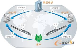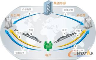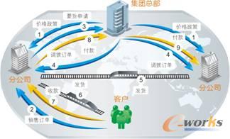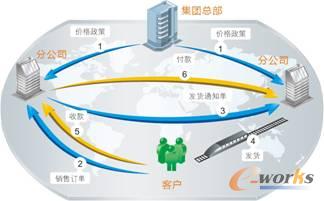 集團(tuán)統(tǒng)一制定銷售政策給各公司執(zhí)行。某個(gè)分公司接到客戶訂單,向集團(tuán)申請(qǐng)要貨;集團(tuán)總部發(fā)出調(diào)撥訂單到其他分公司調(diào)貨;接到調(diào)撥訂單的分公司進(jìn)行生產(chǎn)并安排發(fā)貨到接單的分公司;接到訂單的分公司再發(fā)貨到客戶,并與客戶結(jié)算收款。接到訂單的分公司向集團(tuán)總部結(jié)算付款;集團(tuán)總部與接到調(diào)撥訂單的分公司結(jié)算付款。