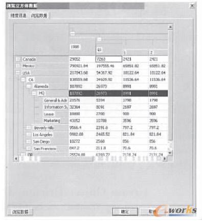 數(shù)據(jù)倉庫是按主題組織數(shù)據(jù)的,每個主題可以看作是一個數(shù)據(jù)立方體,一般每個數(shù)據(jù)立方體都有好幾個維,每個維內又有一些層次。復雜的數(shù)據(jù)立方體在展現(xiàn)上缺乏直觀性,尤其當維度超出三維后,數(shù)據(jù)的表示就比較困難,因此這里采用一種二維表格的形式來表示整個數(shù)據(jù)立方體,并在此之上進行多維分析操作。數(shù)據(jù)立方體中的維都被劃分到行維或列維兩種維度中去,在二維表的固定行和固定列中用樹型結構體現(xiàn)維的層次結構和層次關系,在行維和列維交織成的二維表中顯示相應的度量數(shù)據(jù),實現(xiàn)以二維表格反映多維特征,提供數(shù)據(jù)立方體的可視化表示。