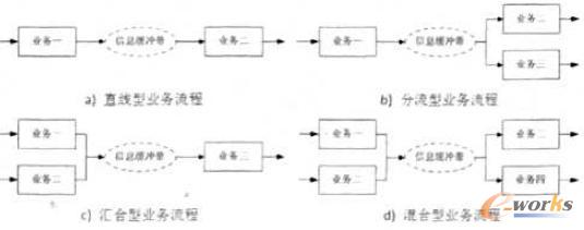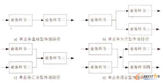 企業(yè)業(yè)務(wù)流程管理,實(shí)質(zhì)上是信息傳遞路徑的規(guī)劃和管理,以及運(yùn)行狀況的監(jiān)控。業(yè)務(wù)管理信息化的首要任務(wù)在于規(guī)劃信息傳遞路徑,具體而言就是業(yè)務(wù)單據(jù)的傳遞路徑和物流路徑的規(guī)劃,繼而是管理分工和流程監(jiān)控,以保障信息系統(tǒng)持續(xù)穩(wěn)定、有序高效地運(yùn)行。按照信息傳遞路徑的特性,可把業(yè)務(wù)流程劃分為4種模型,即直線型、分流型、匯合型和混合型,如圖1所示