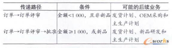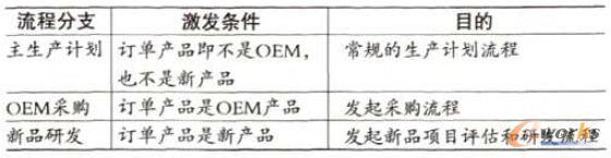 本實(shí)例展示的是典型的混臺型業(yè)務(wù)流程,從中可以看出,從銷售訂單出發(fā)驅(qū)動若干后續(xù)業(yè)務(wù),展示了跨業(yè)務(wù)的主營業(yè)務(wù)流程的全貌。其中主生產(chǎn)計(jì)劃、0EH采購和新品研發(fā)三個分支是互斥的,這三十分支與發(fā)貨分支不是互斥的。在信息化流程規(guī)劃中,給互斥的二個分支分別設(shè)定特定激發(fā)條件以明確信息傳遞的特定方向,如表1所示。