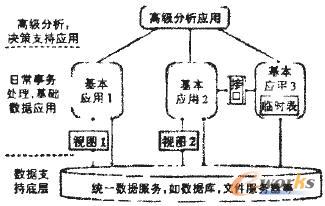 圖1是構(gòu)建在統(tǒng)一數(shù)據(jù)服務(wù)平臺(tái)上的三層系統(tǒng)結(jié)構(gòu)示意圖。由于采用了統(tǒng)一數(shù)據(jù)服務(wù)平臺(tái),可以減少接口的數(shù)量。當(dāng)有新的應(yīng)用加入時(shí),要先將新的需要數(shù)據(jù)加入到數(shù)據(jù)服務(wù)平臺(tái)中,然后再構(gòu)建應(yīng)用。應(yīng)當(dāng)指出,統(tǒng)一數(shù)據(jù)服務(wù)平臺(tái)要注重邏輯上的統(tǒng)一性,有的數(shù)據(jù)雖然在同一個(gè)服務(wù)器內(nèi),但是構(gòu)建了很多有重復(fù)結(jié)構(gòu)的表,其實(shí)質(zhì)仍然不是統(tǒng)一的數(shù)據(jù)平臺(tái)服務(wù)。