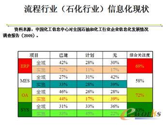 這個數(shù)據(jù)是來源于我們的行業(yè)協(xié)會提供的一個數(shù)據(jù)。相對來說,流程行業(yè)一般企業(yè)規(guī)模都比較大,信息化的基礎(chǔ)相對比較好,走在其他行業(yè)的前列,通過表格可以看到,流程行業(yè)已經(jīng)應(yīng)用了哪些系統(tǒng)。在當(dāng)今無論是ERP還是大家剛才介紹的生產(chǎn)管理控制系統(tǒng),這些在流程行業(yè)都有深入的應(yīng)用。從圖上還能看到截止到2009年底流程行業(yè)的總的態(tài)勢和水平,已不僅僅滿足于簡單的財務(wù)這樣一個應(yīng)用。