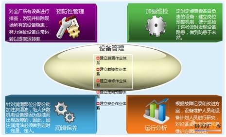 在生產(chǎn)管理方面,我們強化了班組管理,生產(chǎn)現(xiàn)場的數(shù)據(jù)的采集,比如說鋼瓶的管理,壓力空氣的管理,這都是現(xiàn)場安全的管理,設(shè)備的管理。設(shè)備的管理在流程行業(yè)至關(guān)重要,因為流程行業(yè)都是連續(xù)生產(chǎn)的,如果設(shè)備停車了,除了影響生產(chǎn),還會造成裝置當(dāng)中的一些物料浪費,造成管道的擁堵,給生產(chǎn)帶來巨大的麻煩。