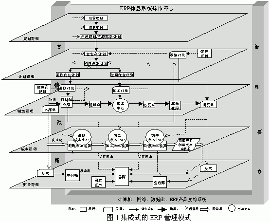 圖1,集成式的ERP管理模式描繪了企業(yè)制造部分的生產(chǎn)、供應(yīng)、銷(xiāo)售、及相關(guān)財(cái)務(wù)部分。