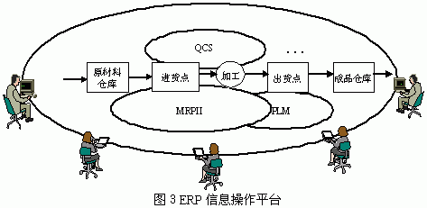信息操作平臺(tái)緊緊地圍繞著企業(yè)“實(shí)體”運(yùn)作,如圖3中的物流系統(tǒng)。一家美資公司管理銘言:“企業(yè)的一切制造活動(dòng)都圍繞著MRPII轉(zhuǎn)!”就是ERP信息操作平臺(tái)真實(shí)的寫(xiě)照。