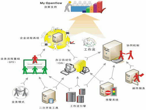 可通過內(nèi)嵌工作流引擎在OpenFlow系統(tǒng)中再現(xiàn)符合企業(yè)的最優(yōu)業(yè)務流程,并輔助郵件、消息服務器建立協(xié)同工作機制,把業(yè)務流程的每一步驟完整地“串”在了一起,實現(xiàn)分工協(xié)同工作。