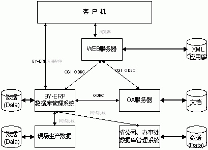 在分布式數(shù)據(jù)庫(kù)支撐下,利用集成平臺(tái)(商品化的原型系統(tǒng),面向?qū)ο蟮拈_(kāi)發(fā)工具,Web技術(shù),JAVA開(kāi)發(fā)語(yǔ)言),OA群件(LOTS/Domino),API(應(yīng)用程序接口)等建立ERP系統(tǒng)和OA系統(tǒng)。