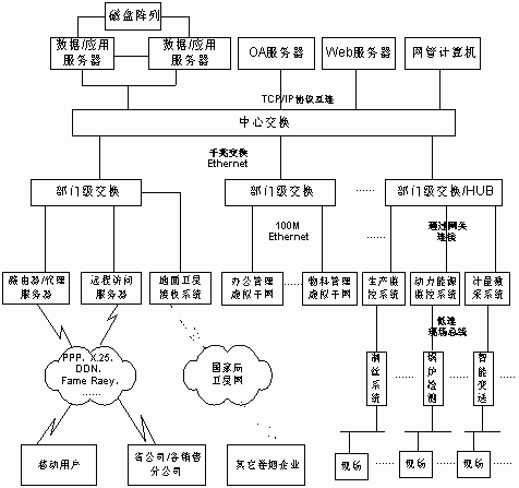 網(wǎng)絡(luò)由廠級(jí)主干網(wǎng)、部門(mén)級(jí)局域網(wǎng)絡(luò)及工業(yè)現(xiàn)場(chǎng)總線三層次構(gòu)成。現(xiàn)場(chǎng)總線網(wǎng)絡(luò)主要分布在各車間,用于連接生產(chǎn)、分析等自動(dòng)采集設(shè)備;部門(mén)級(jí)網(wǎng)絡(luò)應(yīng)用在各車間、各業(yè)務(wù)部門(mén)及綜合辦公樓;廠級(jí)網(wǎng)絡(luò)連接各部門(mén)級(jí)網(wǎng)絡(luò)和服務(wù)器,構(gòu)成網(wǎng)絡(luò)系統(tǒng)的主干。