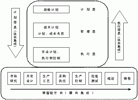 縱向企業(yè)集成是面向制造領(lǐng)域的集成,是指在不同的控制和管理層的系統(tǒng)之間的集成,打破企業(yè)底層制造執(zhí)行系統(tǒng)和上層的制造管理系統(tǒng)上下之間的交流障礙。其目標(biāo)是共同分享企業(yè)內(nèi)信息,對(duì)業(yè)務(wù)過(guò)程中的一些問(wèn)題迅速作出決策。