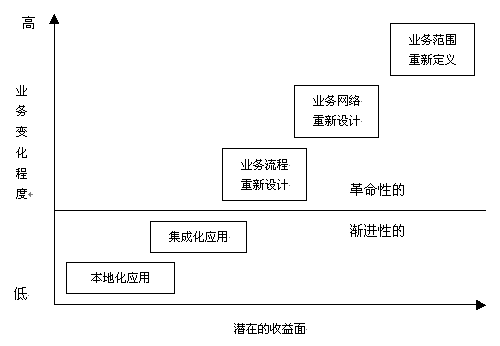 從模式1到模式2是一個自然發(fā)展的漸進過程,一般發(fā)生在開始應用IT的一段時間之后。遺憾的是,這一階段的收益也無疑是一個緩慢過程,企業(yè)一般沒有充分發(fā)揮IT手段的潛能。應用模式3、4、5則發(fā)生了革命性的變化,這些應用模式不是從現(xiàn)有的工作方式開始應用IT,而是注重對人們已習慣的原有工作方式與工作流程進行重新改造與設計,然后發(fā)揮IT手段支持新的工作方式的能力。改造過程愈深,改造范圍愈廣,收益也就愈大