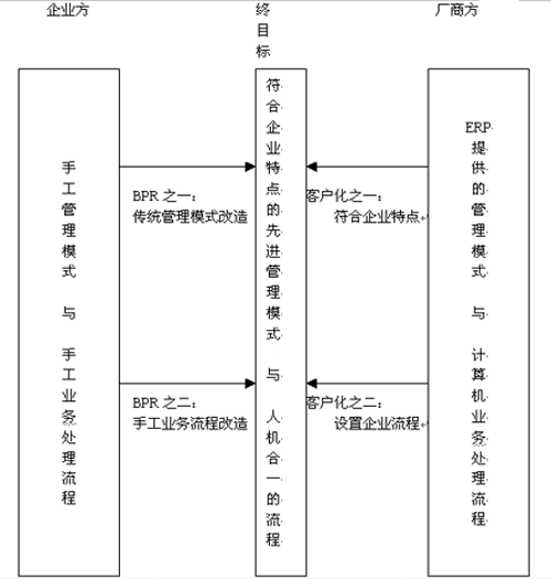 第二,企業(yè)手工業(yè)務處理流程必然存在很多重復或無效的業(yè)務處理環(huán)節(jié),很多業(yè)務處理方式也不符合計算機信息處理的要求,為此需要對手工業(yè)務處理流程進行重組,這是ERP實施過程對企業(yè)進行BPR的內容之二。另一方面,在重新設計出企業(yè)新的業(yè)務處理流程后,需要對軟件功能按新的業(yè)務處理流程進行客戶化菜單設置或調整,這是ERP實施過程中客戶化工作的內容之二。從兩個方面的改造或調整,最后達到在計算機業(yè)務處理方式下的“人機合一”的和諧境界。
