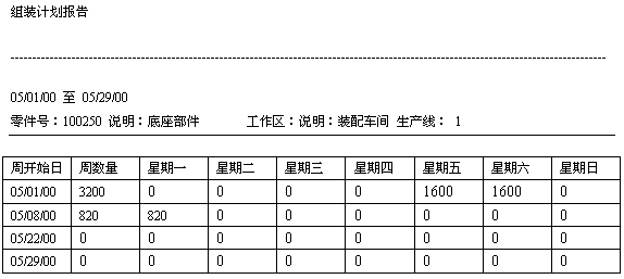 生產(chǎn)計(jì)劃報(bào)表包含的信息有:零件號(hào)、零件描述、所加工的車間代號(hào)及描述、主碼代號(hào)包含了該零件的工作中心及WIP貨位、周開(kāi)始日、周數(shù)量及在一周內(nèi)每日的生產(chǎn)計(jì)劃量。如表2組裝計(jì)劃報(bào)告