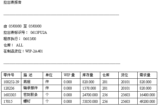 生產(chǎn)要補(bǔ)充的部件——確認(rèn)W.C2的申請(qǐng)計(jì)劃,下達(dá)加工單,打印“拉出表”(見(jiàn)表1拉出表報(bào)告)并到W.C1的Store領(lǐng)取物料,按時(shí)完成加工任務(wù)。加工任務(wù)完成后反沖,入庫(kù)到W.C2的半成品Store貨位。