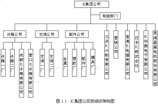 K集團(tuán)公司下屬有冰箱公司及下屬冰箱一廠、冰箱二廠、成都、營口K公司冰箱有限公司等等;空調(diào)公司下屬空調(diào)一廠、空調(diào)二廠、南昌K公司、鄭州K公司等等;配件公司及下屬金屬廠、塑膠廠、配件廠、模具廠等分廠;三洋K公司、營銷公司、香港K公司電器等等都直屬集團(tuán)公司管轄。如圖1.1,