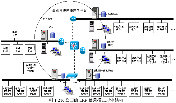 在“整體設(shè)計(jì),分步實(shí)施”宗旨的指引下,K公司的ERP系統(tǒng)總體結(jié)構(gòu)囊括了產(chǎn)品設(shè)計(jì)(CAD/PDM)、工藝設(shè)計(jì)(CAPP)、制造資源計(jì)劃(MRPII)、辦公自動(dòng)化(OA)、電子商務(wù)等。K公司通過采用ERP系統(tǒng)較好地實(shí)現(xiàn)了多地域、多工廠、多子母公司,“分布運(yùn)行、集中控制”的經(jīng)營管理方式。