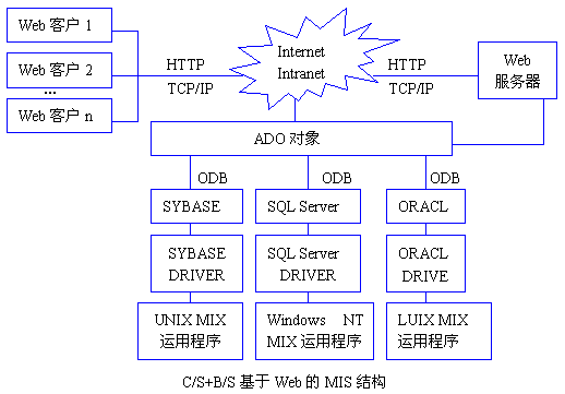 如圖所示,這種管理體系是基于網(wǎng)絡(luò)的、分布式的、異構(gòu)的管理信息系統(tǒng),這種體系可以容納不同地域、不同網(wǎng)絡(luò)結(jié)構(gòu)類型、采用不同數(shù)據(jù)庫和應用程序開發(fā)工具、在功能上相對獨立的管理信息系統(tǒng)、各種管理信息系統(tǒng)通過web服務器,在客戶端以瀏覽器方式訪問,實現(xiàn)系統(tǒng)之間的信息共享。