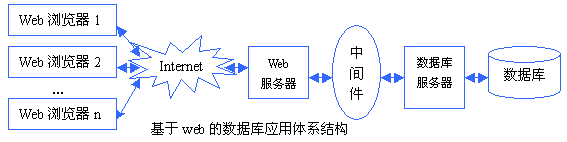 Web系統(tǒng)的基礎(chǔ)模式是三層體系結(jié)構(gòu)的B/S。第一層是用瀏覽器完成用戶的接口功能;第二層由各種服務器完成用戶所需的服務功能;第三層有由數(shù)據(jù)服務器完成數(shù)據(jù)存儲和管理功能;趙eb訪問數(shù)據(jù)庫的應用通常包含以下4部分的內(nèi)容:web服務器、web瀏覽器、數(shù)據(jù)庫服務器、中間件(如路由器,集線器等),其體系結(jié)構(gòu)如下圖: