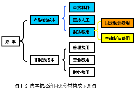 1、成本按經(jīng)濟(jì)用途分為直接材料費(fèi)用、直接人工費(fèi)用和制造費(fèi)用三部分(如圖1-2所示),沒(méi)有把制造費(fèi)用進(jìn)行進(jìn)一步區(qū)分為固定制造費(fèi)用和變動(dòng)制造費(fèi)用,這樣的成本分類不利于考察產(chǎn)品成本的動(dòng)因;基于此,完全成本法難以正確計(jì)算產(chǎn)品的贏利,也無(wú)法揭示業(yè)務(wù)量、成本、利潤(rùn)三者之間的依存關(guān)系,當(dāng)然就更談不上成本控制、利潤(rùn)預(yù)測(cè)和產(chǎn)品生產(chǎn)組合決策的制訂;