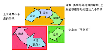 在管理處于生命周期不同階段的典型系統(tǒng)時,企業(yè)采用的技巧很不相同(如圖1)。借助外部力量(包括系統(tǒng)集成商和供應(yīng)商的技術(shù)專家)的幫助,計劃、采購和實施一個新系統(tǒng)通常都能執(zhí)行得不錯。一旦該解決方案“運(yùn)轉(zhuǎn)”起來,“ERP的飛行”仿佛進(jìn)入了“平穩(wěn)期”。然而,隨后的改善并最終淘汰該系統(tǒng)的階段往往才是企業(yè)的難關(guān)。