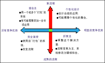 在項目實施前期,企業(yè)必須決定他們是全盤接受打包的系統(tǒng),還是對此進(jìn)行適當(dāng)?shù)牟脺p以滿足業(yè)務(wù)流程的獨特需求。哪種方式最好?企業(yè)應(yīng)該權(quán)衡保留系統(tǒng)的成熟流程和變革系統(tǒng)能獲得的競爭優(yōu)勢這兩個方面,然后確定每個需求在如圖3所示矩陣的哪個位置最能得到滿足。