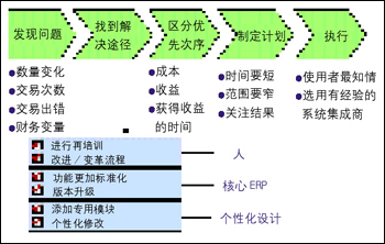 找到解決問題的辦法。系統(tǒng)的問題通常有多種表現(xiàn)方式。找到問題后,要想出解決辦法,重要的是從培訓(xùn)、變革流程到個性化設(shè)計等方面通盤考慮。很多時候,通過培訓(xùn)和流程變革就能解決問題的時候,企業(yè)總以為是系統(tǒng)出了問題。企業(yè)應(yīng)該在其它途徑都考慮過后,最后才考慮進(jìn)行個性化設(shè)計。