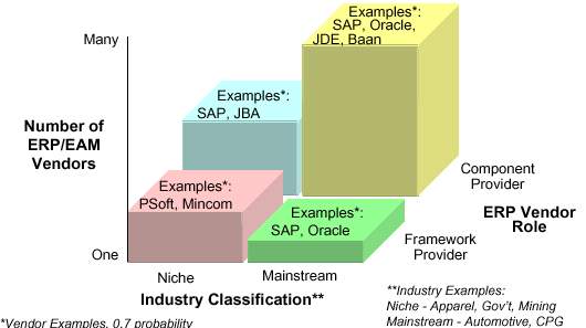 隨著ERP迅速轉(zhuǎn)化為商品,進(jìn)行縱向聯(lián)盟將成為當(dāng)今多數(shù)ERP提供商的生死存亡的問(wèn)題。Ccommerce的興起,以及隨之產(chǎn)生的提供商在縱向行業(yè)中的兩分化(一類(lèi)提供架構(gòu),另一類(lèi)提供要件),使得提供商的風(fēng)險(xiǎn)增加。他不只是對(duì)參與何種縱向行業(yè)進(jìn)行選擇,還必須決定他們將支持何種商業(yè)流程以及在這些縱向行業(yè)中他們將扮演何種角色。到2004年,將不會(huì)有CRM或SCM提供商進(jìn)入ERP市場(chǎng)(概率為0.6)。