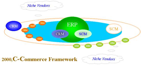 Ccommerce將極大地改變ERP市場(chǎng)的演進(jìn)過(guò)程。企業(yè)必須在一個(gè)互動(dòng)式企業(yè)環(huán)境中運(yùn)行,這一要求將會(huì)使傳統(tǒng)的、集中于內(nèi)部業(yè)務(wù)流程、功能擴(kuò)張及“企業(yè)內(nèi)”整合的ERP提供商處于困境。其結(jié)果是,市場(chǎng)將會(huì)轉(zhuǎn)而支持兩類(lèi)ERP提供商的功能組合。