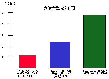 不容置疑的CPC潛力如果說幫助企業(yè)實現(xiàn)一種跨企業(yè)、跨平臺的協(xié)同設(shè)計與開發(fā)的工作模式,是實施CPC的具體內(nèi)容,那么“提高產(chǎn)品設(shè)計效率”是CPC最為明顯的功能表現(xiàn)。美國著名IT分析公司Gartner Group的數(shù)據(jù)表明,企業(yè)運(yùn)用CAD/CAM/CAE等專業(yè)工具提高產(chǎn)品設(shè)計效率在10%~20%之間,因此取得的競爭優(yōu)勢只能持續(xù)1年多;企業(yè)運(yùn)用VPDM/PDM(產(chǎn)品數(shù)據(jù)管理)等系統(tǒng)可以縮短產(chǎn)品開發(fā)周期30%,企業(yè)因此取得的競爭優(yōu)勢只能持續(xù)2年半;而企業(yè)實施CPC系統(tǒng)管理帶來的將是戰(zhàn)略性的產(chǎn)品創(chuàng)新,因此取得的競爭優(yōu)勢能持續(xù)近5年。