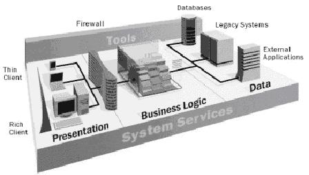 業(yè)界當(dāng)前比較成熟的解決方案是三層結(jié)構(gòu)設(shè)計(jì),例如基于微軟體系架構(gòu)的金蝶K/3ERP系統(tǒng)就是使用典型的WindowsDNA三層體系結(jié)構(gòu)。它具有數(shù)據(jù)訪問安全性、增強(qiáng)的事物對象管理、高可用性、強(qiáng)大的可擴(kuò)展性等突出特點(diǎn)。