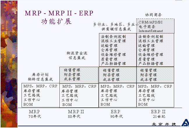 借用ERP資深專家陳啟申老師的一幅圖(圖3),清晰地描述了從MRP到ERPⅡ的發(fā)展過程?梢钥闯,ERP系統(tǒng)不是突然冒出來的,它是在MRP、MRPⅡ的基礎(chǔ)上發(fā)展起來的。MRPⅡ包含了MRP的功能,又增加了財務(wù)會計和管理會計的功能;而ERP包含了MRPⅡ的功能,又增加了供需鏈的管理,也就是超出企業(yè)內(nèi)部管理的功能。正在發(fā)展的ERPⅡ既包含了ERP的功能,又增加了協(xié)同商務(wù)所必須的技術(shù)和相應(yīng)的功能,突出在異構(gòu)平臺之間的信息集成。
