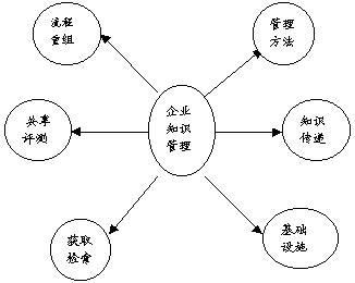 知識管理大致包括以下六個內(nèi)容:(一)知識管理的基礎(chǔ)措施:它是知識管理的支持部分,如關(guān)系數(shù)據(jù)庫、知識庫、多庫協(xié)調(diào)系統(tǒng)、網(wǎng)絡(luò)等一些基本的技術(shù)手段和知識鏈上最為重要的要素人以及人與人之間的各種聯(lián)系渠道等等;(二)企業(yè)業(yè)務(wù)流程的重組,其目的是使企業(yè)的知識資源更加合理地在知識鏈上形成暢通無阻的知識流,讓每一個員工在獲取與業(yè)務(wù)有關(guān)的知識的同時,都能為企業(yè)貢獻(xiàn)自己的知識、經(jīng)驗和專長;(三)知識管理的方法:內(nèi)容管理、文件管理、記錄管理、通訊管理等;(四)知識的獲取和檢索:包括了各種各樣的軟件應(yīng)用工具,例如智能客體檢索、多策略(吸收反芻、加權(quán)歸納、交互選擇等)獲取、多模式獲取和檢索(數(shù)據(jù)、文本、語音、圖形圖象、電子表格、影視等)、多方法多層次獲取和檢索、網(wǎng)界網(wǎng)搜索工具等;(五)知識的傳遞:如建立知識分布圖、電子文檔、光盤、DVD、及網(wǎng)上傳輸、打印等等;(六)知識的共享和評測:如建立一種良好的企業(yè)文化、激勵員工參與知識共享、設(shè)立知識總管CKO、促進(jìn)知識的轉(zhuǎn)換、建立知識產(chǎn)生效益的評測條例等,如下圖所示。