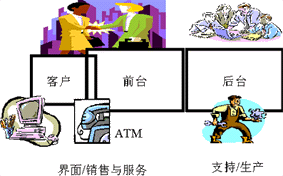 按以客戶為中心的理念來看,企業(yè)由前臺和后臺構成。如下圖二所示。前臺是指客戶同企業(yè)互相間的“交手”發(fā)生地。后臺是指向前臺提供有效的支持與交送服務和生產(chǎn)維修的地方。前臺和后臺的信息系統(tǒng)將進一步融合。后臺軟件產(chǎn)品的供應商,如ERP廠商,將繼續(xù)擴充自身的前臺管理功能。前臺軟件的供應商,如CRM、呼叫中心等廠商,也將增強自身的前臺產(chǎn)品與其它后臺產(chǎn)品的集成能力。
