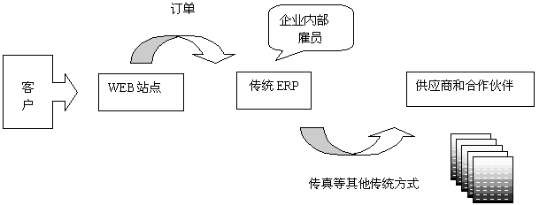 目前,越來越多的企業(yè)意識到電子商務是企業(yè)發(fā)展的必經(jīng)階段。于是,企業(yè)紛紛搭建網(wǎng)絡,開通網(wǎng)站,發(fā)布信息,開展網(wǎng)上直銷。在做了這些之后,許多企業(yè)發(fā)現(xiàn)事與愿違,最終的結果與期望值相距甚遠,個中原因雖然很多,但一個重要的因素就是企業(yè)還沒有深刻理解電子商務的全部內涵和真實本質,忽視了企業(yè)內部流程與外部交易的整合。而電子商務的本質是企業(yè)利用電子方式在客戶、供應商和合作伙伴之間實現(xiàn)在線交易、相互協(xié)作和價值交換。上圖(以BtoC為例)所示為企業(yè)的目前模式,客戶可以在網(wǎng)站下達訂單,并傳遞至ERP系統(tǒng)(有些傳統(tǒng)ERP可接受電子訂單),而企業(yè)與供應商及合作伙伴之間采購請求、外協(xié)外制、貨物供應、產(chǎn)品配送等仍然是通過傳統(tǒng)方式,未能實現(xiàn)網(wǎng)絡化,游離在交易鏈之外。實現(xiàn)在線購物僅僅是電子商務的簡單呈現(xiàn),后臺應用仍然效率低下,電子商務的即時性無從體現(xiàn),整個交易鏈是斷裂和脫節(jié)的。在電子商務模式下,可能所有競爭對手都是在線商家,用戶移動鼠標即可輕易轉向競爭對手。在如此競爭環(huán)境下,一個快速、柔性的交付模式和流暢的后勤系統(tǒng)和配送體系將是取勝的關鍵。另一方面,前端只能接受簡單購買指令,不能有效利用網(wǎng)絡追蹤、記錄客戶購買行為,開展客戶購買喜好的研究分析,從而實現(xiàn)交互和優(yōu)先銷售;同時,缺乏客戶自助服務(SELFSERVICE)的網(wǎng)上營銷,沒有實現(xiàn)個性化、專門化的具體服務,難以提高品牌美譽度和客戶忠誠度。