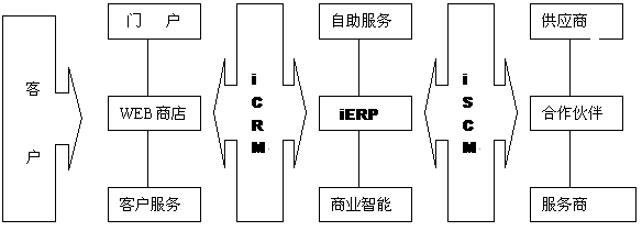 上圖顯示的是真正的在線交易模式(BOL)。從客戶到供應商完全連通,企業(yè)內部流程與外部交易完全一體化。通過客戶關系管理(iCRM)實現(xiàn)與客戶的互動營銷:研究消費行為,前瞻地、全局性銷售預測;形成一對一有效目標市場,發(fā)掘客戶價值;幫助客戶自助服務;集成呼叫中心(CALL CENTER),實現(xiàn)服務快速響應。通過供應鏈管理(iSCM)實現(xiàn)整個物流體系的即時協(xié)作:分銷資源計劃(DRP)實現(xiàn)協(xié)同銷售,暢通銷售渠道;供應商看板管理(KANBAN)使物料需求狀況實時傳遞給供應商,實現(xiàn)零庫存。iERP將企業(yè)的傳統(tǒng)業(yè)務和管理網(wǎng)絡化,連接前后端,成為整個交易鏈的中樞。透過網(wǎng)絡,客戶的要求或訂單,理論上可以零等待地傳遞至整個供應鏈,交易和供給幾乎同時發(fā)生;透過網(wǎng)絡,企業(yè)內外之間的界限將逐漸模糊直至消失。這樣一種模式,真正體現(xiàn)了網(wǎng)絡經(jīng)濟以客戶為中心的思想和電子商務端到端的實質。
