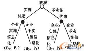 (4)信息集:政府只有一個(gè)信息集,兩個(gè)可供選擇的行動(dòng)。其信息集為:S1=(實(shí)施,不實(shí)施);而企業(yè)有兩個(gè)信息集,每個(gè)信息集上有兩個(gè)可選擇的行動(dòng),因而共有四個(gè)戰(zhàn)略決策。其信息集為:S2={(信息化,信息化),(信息化,非信息化),(非信息化,信息化),(非信息化。非信息化)};