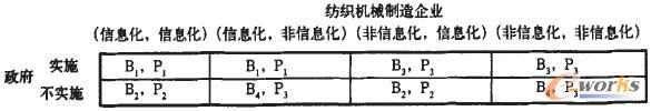 在推進(jìn)信息化建設(shè)的過(guò)程中,各方經(jīng)濟(jì)主體都要隨情況變化采取不同應(yīng)對(duì)措施,以保障自身獲取最優(yōu)利益。紡織機(jī)械制造企業(yè)信息化也是以利潤(rùn)最大化為主導(dǎo)原則,只有經(jīng)過(guò)成本效益分析而且有利時(shí),企業(yè)才能主動(dòng)引用信息技術(shù)。而政府作為信息化建設(shè)的推動(dòng)者不僅要考慮國(guó)家的整體利益,同時(shí)也要兼顧企業(yè)的利益。因此,紡織機(jī)械制造業(yè)信息化就是政府和企業(yè)不斷進(jìn)行博弈選擇,不斷推進(jìn)的過(guò)程。