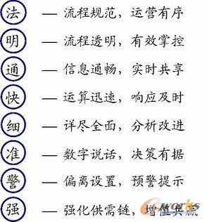 借助信息技術(shù)的支持,信息化管理(如ERP)具備許多手工管理無法做到的功能特點,可以用8個字概括,即:法、明、通、快、細、準、警、強,簡要說明如下。