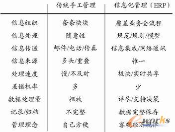 信息化管理決不是手工管理的翻版,它們是兩種不同的管理模式;它們之間的區(qū)別可以用下表說明。