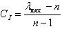(5)一致性檢驗(yàn) 模糊比較矩陣一致性是指要求矩陣元素滿足aik*akj=aij,而評(píng)判矩陣的各元素的賦值是由決策者根據(jù)各元素相互重要性設(shè)定的,但有時(shí)會(huì)出現(xiàn)“甲比乙重要,乙比丙重要,但丙又比甲重要”違背邏輯一致性的可能,一致性C的計(jì)算方法如下式。