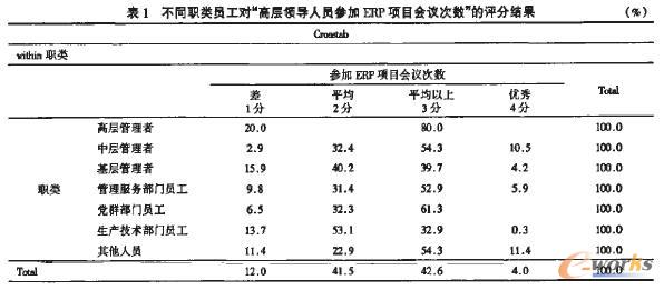 從表1中可以看出,不同職類員工對“高層領(lǐng)導(dǎo)人員參加ERP項目會議次數(shù)行這個問題的評分各不相同,比如高層管理者中有20%的人打了1分,即%的人打了3分,而中層管理者中僅有2.9%的人打了1分,還有10.5%的人認(rèn)為優(yōu)秀。