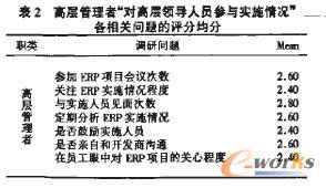 總體來說,所有員工中有41.5%和42.6%的人分別打了2分和3分,說明他們對“高層領(lǐng)導(dǎo)人員參加ERP項目會議的次數(shù)”基本滿意。同樣,我們也可以統(tǒng)計得到不同年齡、工齡和學(xué)歷的員工對各個調(diào)研問題的評分均分。從表2中可以看出,高層管理者“對高層領(lǐng)導(dǎo)人員參與實(shí)施情況”各相關(guān)問題的評分均分都界于2分和3分之間,說明他們對高層領(lǐng)導(dǎo)人員參與項目實(shí)施的各方面情況是基本滿意的。用同樣的方法,我們也可以得到中層管理者、生產(chǎn)技術(shù)人員等和不同年齡段、不同學(xué)歷的員工對各調(diào)研問題的評分均分。進(jìn)一步,綜合對表2中列出的各相關(guān)問題的評分,我們可以得到不同職類員工“對高層領(lǐng)導(dǎo)人員參與實(shí)施情況”的總體評價結(jié)果,通過統(tǒng)計分析,我們不僅可以很清楚的了解到不同屬性員工對各調(diào)研問題的反饋意見,還可以進(jìn)一步綜合上升到對各指標(biāo)的評價,比如:高、中層管理者對“高層領(lǐng)導(dǎo)人員的匹配度”評分均值為2.5429,即達(dá)到平均次數(shù),基本滿意。