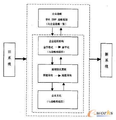 ERP的應(yīng)用對(duì)企業(yè)組織會(huì)產(chǎn)生影響,同時(shí)ERP應(yīng)用能否成功也受企業(yè)組織的影響。為了使ERP得到成功的應(yīng)用。企業(yè)必須調(diào)整組織,使之與ERP系統(tǒng)相協(xié)調(diào)。但需要注意的是,調(diào)整組織不能僅僅只考慮ERP系統(tǒng)的應(yīng)用,也就是說不能僅僅只考慮技術(shù)問題,還需要考慮企業(yè)的戰(zhàn)略、業(yè)務(wù)流程,因?yàn)檫@些都與組織有關(guān)。所以,構(gòu)建與ERP相匹配的組織,應(yīng)以企業(yè)戰(zhàn)略為導(dǎo)向,以流程為驅(qū)動(dòng),并與ERP系統(tǒng)結(jié)合起來(lái),以ERP系統(tǒng)平臺(tái)為支撐,形成一個(gè)系統(tǒng)化的組織變革策略。實(shí)現(xiàn)企業(yè)組織向以企業(yè)戰(zhàn)略為目標(biāo)、面向流程的扁平化組織方向轉(zhuǎn)變.從而使企業(yè)組織既可以滿足企業(yè)戰(zhàn)略的需要,也可以面向流程、支持企業(yè)流程的運(yùn)行,同時(shí)通過ERP系統(tǒng)所提供的扁平化、網(wǎng)絡(luò)化和虛擬化的基于信息技術(shù)的組織結(jié)構(gòu)模型,實(shí)現(xiàn)組織的系統(tǒng)化變革。