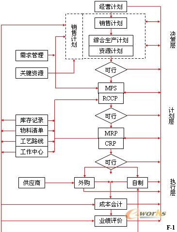 F-1是MRPⅡ邏輯流程圖。RCCP和CRP是完成時間計劃的主要環(huán)節(jié)。它的處理思路是: