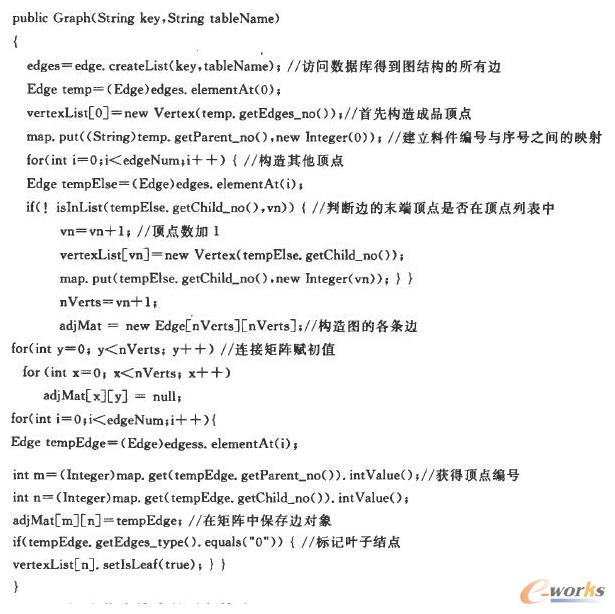 BOM圖形結構構造過程為:首先讀取成品編碼構造圖的第一個頂點,隨后依次無重復的讀入子級料件編碼,建立頂點隊列,再由父級料件編號與子級料件編號的對應關系建立全部弧線,實現(xiàn)代碼為: