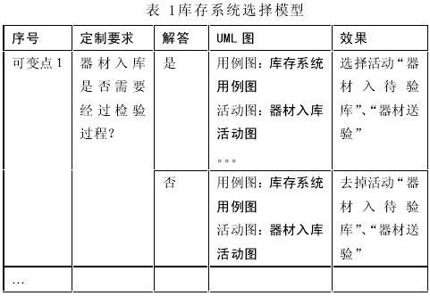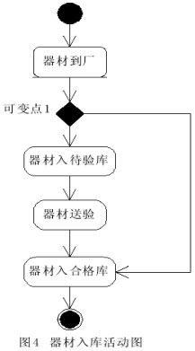 對于軟件生產(chǎn)線,它的可變點存在于從需求分析直到設(shè)計、實現(xiàn)的各個階段。例如:兩個制造企業(yè)都要完成器材的出入庫的功能,但是,某個企業(yè)在器材入合格庫之間需要首先進(jìn)入待驗庫,而另一個企業(yè)則無需經(jīng)過器材檢驗的步驟。這種系統(tǒng)層的可變點通過標(biāo)準(zhǔn)UML語言無法實現(xiàn)。軟件生產(chǎn)線的可變點描述既要實現(xiàn)同一產(chǎn)品族系統(tǒng)的集成,又要清晰地表現(xiàn)同一產(chǎn)品族內(nèi)單個系統(tǒng)之間的可變性。