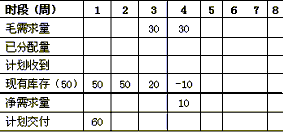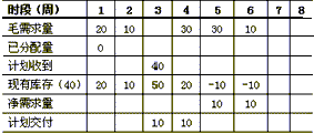 以上計(jì)算過程表明雖然1,2,4,6周均需要A,但實(shí)際A只要3及4周交付10個(gè)即可以了。這個(gè)計(jì)劃下達(dá)時(shí)間和數(shù)量就是部件B和C的毛需求的時(shí)間和數(shù)量。